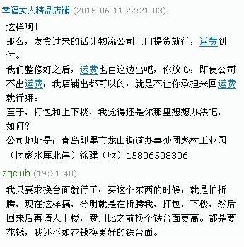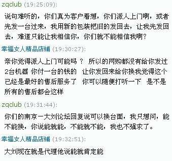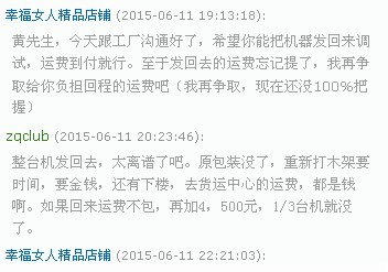 现在的心情真不知是死心还是愤怒,好好的心情就给搞坏了。 6/8 联系“幸福女人精品店铺”,说先要和厂家沟通。 6/9 说工厂停电,没上班,要再等。然后又咨询我加价500换铁台面行不行 6/10 感觉加500元有点贵,毕竟没打折时,大理石和铁台面差价才400元,8折后,差价就更只有320了。就回复说只换大理石台面就行了。 6/11 突然回复说要把整机发回去调试,发回去的运费包,但发回来的运费不包,尽量帮我争取啦。 天啊,要整台机发回去,原包装都没了,要怎么打包回原样?还有,就算打包好了,下楼,去货运公司,这些都是体力活和金钱啊!万一再来个发回来的运费不包,花个4,500,然后又要请人上楼,安装,花的钱,起码都值1/3台机了。甚至碰到物流损坏,或者说缺了零件,来个说我损坏的,或者拒收,折腾不起啊……。 但这次回复后,等了一个小时都没回复,只能先下线了。 刚才又上线,终于看到回复了,商家说可以包来回的运费。 但因为整个打包回去,难度实在是太大了,我只要求换个台面,一个台面就整机发回去,不知道有多少人赞成这个观点? 如果都这样搞,以后有个螺丝孔问题,油漆问题什么的,都让整机发回去,我看10个有9个就只能骂两句,你们的目的也达到了。 附件 20158 附件 20159 附件 20160 附件 20161 |